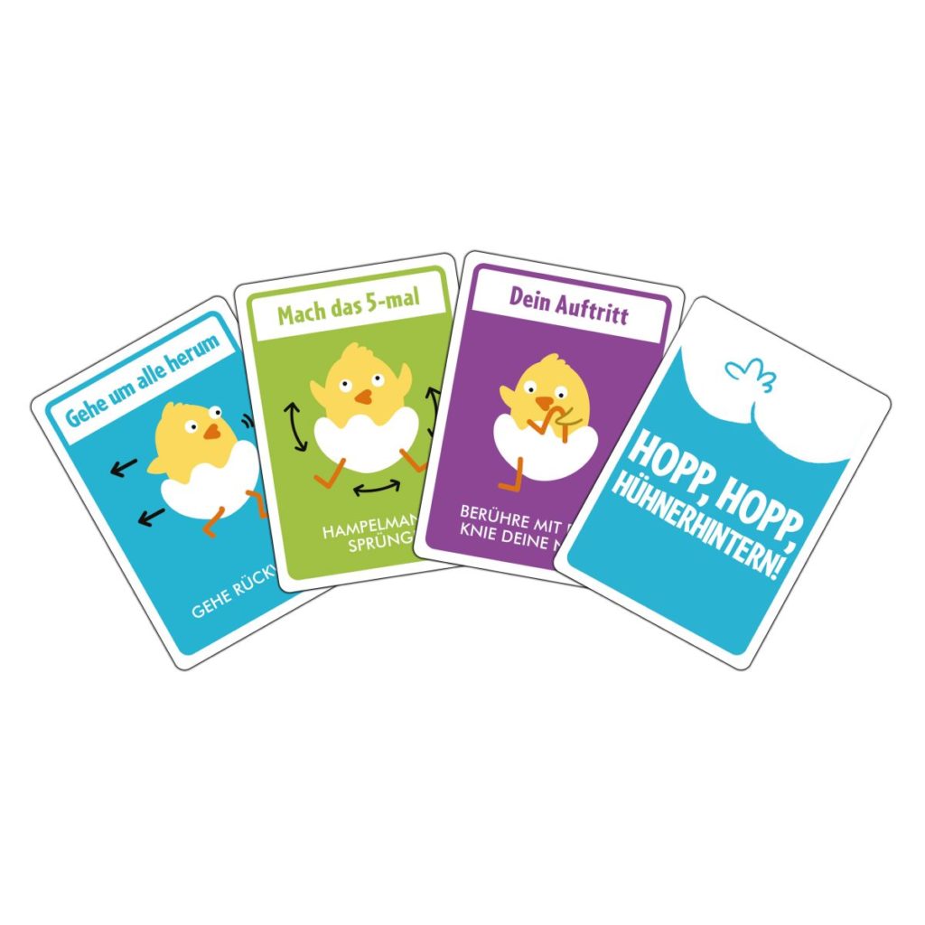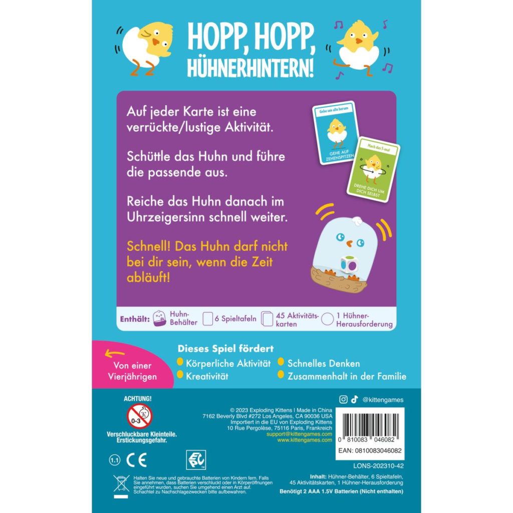 Ein verrücktes Kinderspiel aus dem Hause Exploding Kittens sorgt für ausgelassenen Spielspaß und jede Menge Gelächter! Im Mittelpunkt steht ein gackernder Huhn-Behälter, der als Timer fungiert und im Kreis herumgereicht wird – Spannung garantiert! Während das Huhn gackert, führen die Spielerinnen und Spieler lustige Aufgaben aus, die durch das Würfelergebnis bestimmt werden. Ob verrückte Bewegungen, witzige Geräusche oder kindgerechte Herausforderungen – mit insgesamt 45 abwechslungsreichen Aktivitäten bleibt garantiert kein Auge trocken.