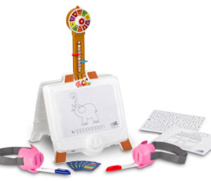 Bei dem lustigen Zeichenspiel „Pigcasso“ von Kade spielen Teams gegeneinander und lösen verschiedene Aufgaben auf Zeit. Die Spieler tragen eine Ferkelnase, an der ein Stift befestigt ist, mit der sie freihändig skizzieren müssen.